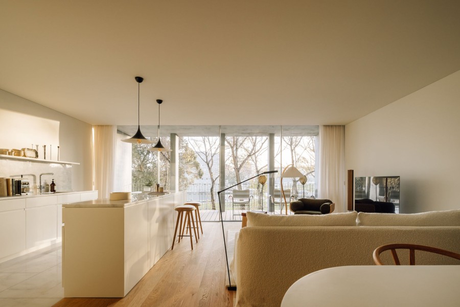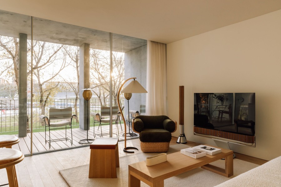 Discípulo de Álvaro Siza, Souto de Moura ha definido un estilo propio basado en el minimalismo, la precisión constructiva y la relación con el paisaje. Entre sus rasgos más distintivos destaca su tratamiento de los ventanales, inspirados en el concepto de “ventana corrida” de Le Corbusier. En The Unique, este principio alcanza su máxima expresión, con grandes ventanales horizontales que parecen flotar sobre la ría y eliminan cualquier elemento superfluo, fusionando interior y exterior en un mismo espacio visual inundado de luz natural.
