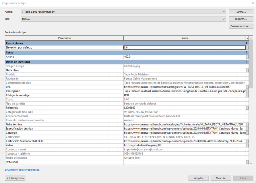 Descargar la biblioteca “Bandejas de cables eléctricos - Metatray - PEMSA.rvt” desde la sección BIM de la web oficial de PEMSA: www.pemsa-rejiband.com/bim.
