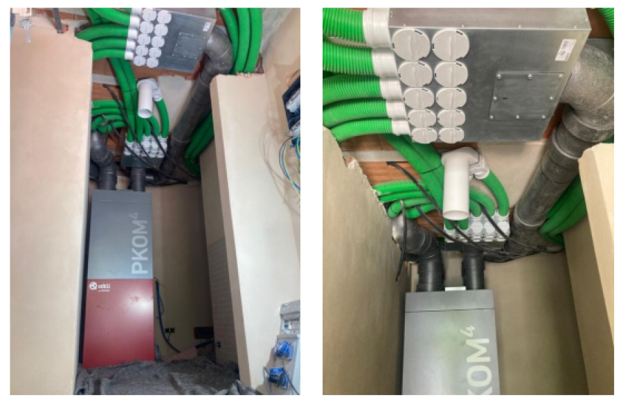 El sistema PKOM⁴ destaca por su recuperación de calor certificada por el Passivhaus Institut, con rendimientos de hasta el 88% estático y 85% entálpico, así como por su bypass automático, que aprovecha el aire nocturno para mejorar el confort en verano.