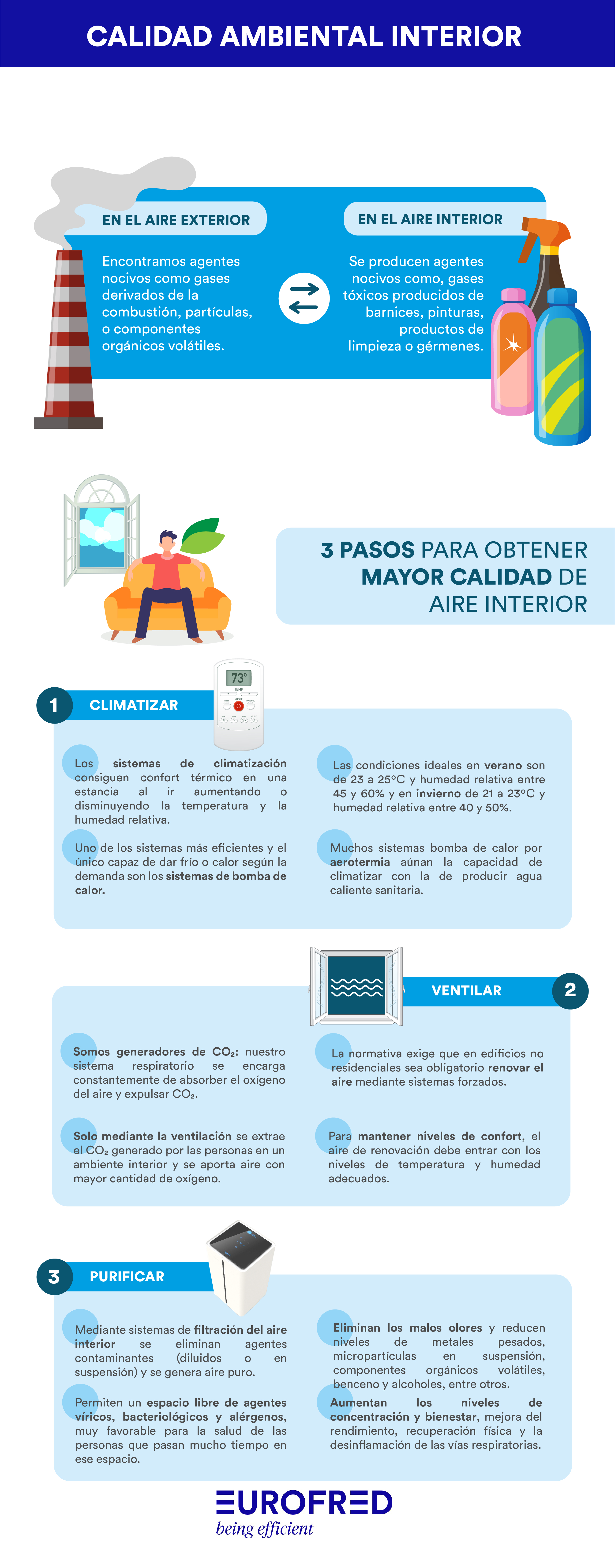 EUROFRED ha desarrollado una infografía en la que descubrimos porque es tan importante la calidad ambiental interior, qué elementos la amenazan y qué podemos hacer para mejorarla.