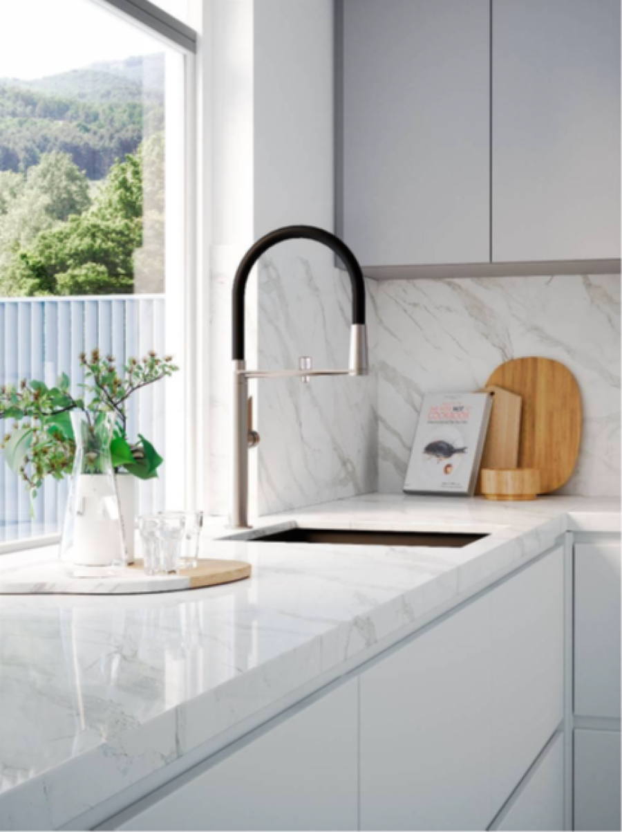 Por otro, la gama Quality Finish, que incluye negro mate con recubrimiento electrostático, así como níquel cepillado y cobre fabricados mediante tecnología PVD. Estos acabados destacan por su extraordinaria dureza, conservando un color estable y alcanzando una resistencia hasta 10 veces superior al cromado, según ensayos certificados de niebla salina. Su estética robusta y actual combina perfectamente con encimeras de mármol o granito, así como con revestimientos de tendencia.