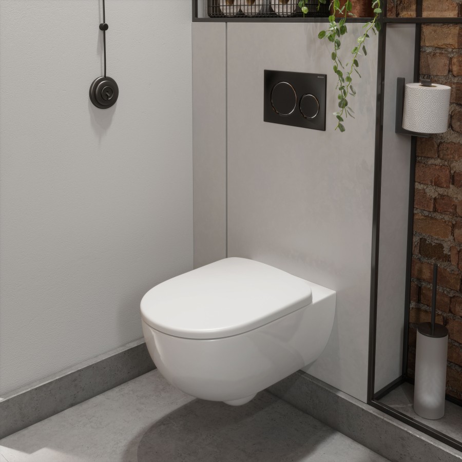 El nuevo Geberit Selnova Premium Rimfree cuenta con una proyección de 53 cm y diseño de forma cerrada, lo que permite ocultar las fijaciones a la pared para una estética más limpia.