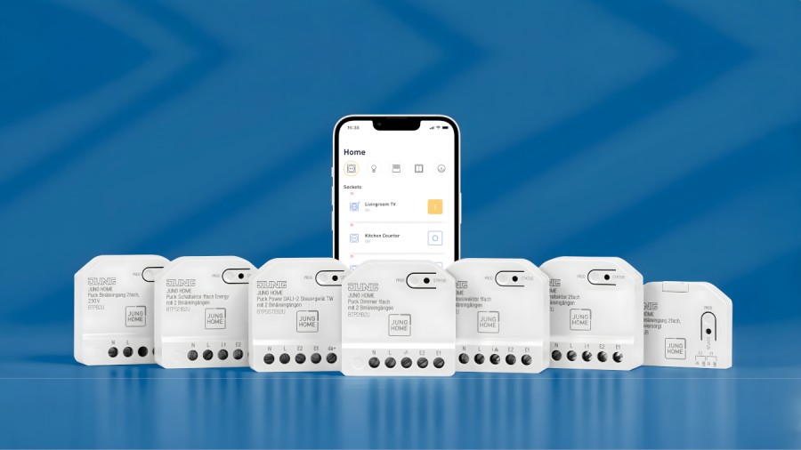 En el ámbito de la domótica y los sistemas inteligentes, el catálogo incorpora nuevas soluciones adaptadas a la creciente demanda de hogares conectados y edificios inteligentes. Entre ellas destacan los JUNG HOME Pucks, dispositivos diseñados para digitalizar instalaciones eléctricas convencionales sin necesidad de realizar obras. Estos módulos utilizan tecnología inalámbrica Bluetooth Mesh de bajo consumo, lo que permite actualizar instalaciones existentes de forma sencilla aprovechando la infraestructura ya instalada. Su diseño facilita la colocación directa detrás de los mecanismos instalados en cajas de empotrar universales.